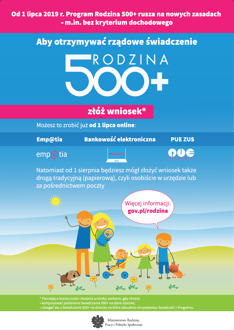 Uprzejmie informujemy, że od 1 lipca 2019r. świadczenie wychowawcze (500+) będzie przysługiwać wszystkim dzieciom do 18 roku życia, bez względu na dochody uzyskiwane przez rodzinę i bez wymogu ustalania alimentów na dzieci od drugiego rodzica, w przypadku osób samotnie wychowujących dzieci.